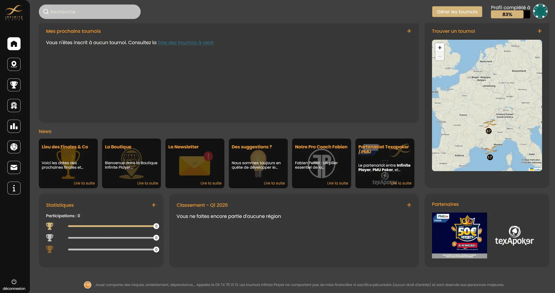Infinite Player est une application web conçu en Nuxt.js / Symfony pour permettre de gérer des tournois de poker IRL (« In real life », soit des tournois en physique). L’application permet aux joueurs de trouver un tournoi de poker dans les bars partenaires, de s’y inscrire, de consulter le classement etc. De plus, l’application permets aux organisateurs des tournois de gérer le tournois en direct (chronomètre, gestion de la place des joueurs aux tables, élimination, gestion des blinds…).